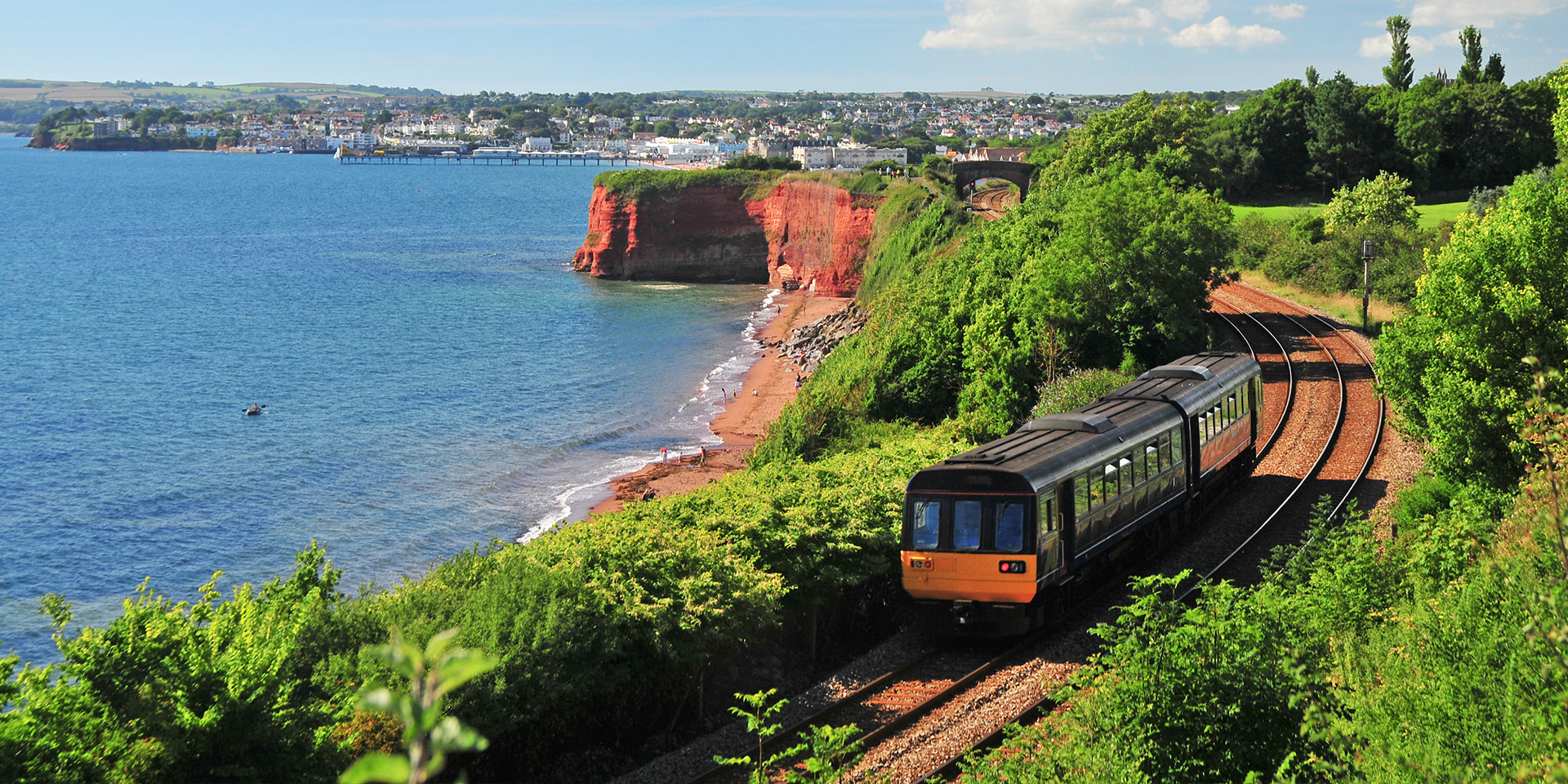 The Riviera Line, so named for its location along the English Riviera in scenic South Devon, runs from Exeter Central to Paignton. Aboard the train, you’ll speed past two estuaries and dramatic cliffsides, hugging the coastline as you head towards the towns of Dawlish, Teignmouth, and Torquay.
