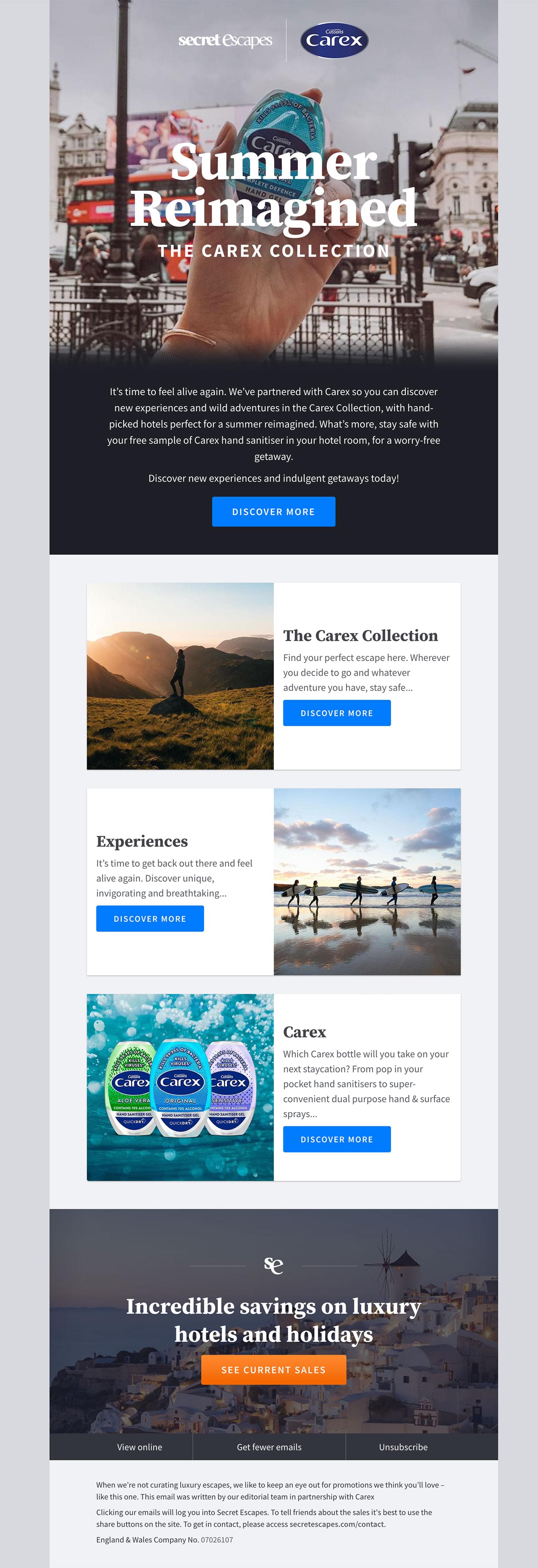 "It’s time to feel alive again. We’ve partnered with Carex so you can discover new experiences and wild adventures in the Carex Collection, with hand-picked hotels perfect for a summer reimagined. What’s more, stay safe with your free sample of Carex hand sanitiser in your hotel room, for a worry-free getaway."