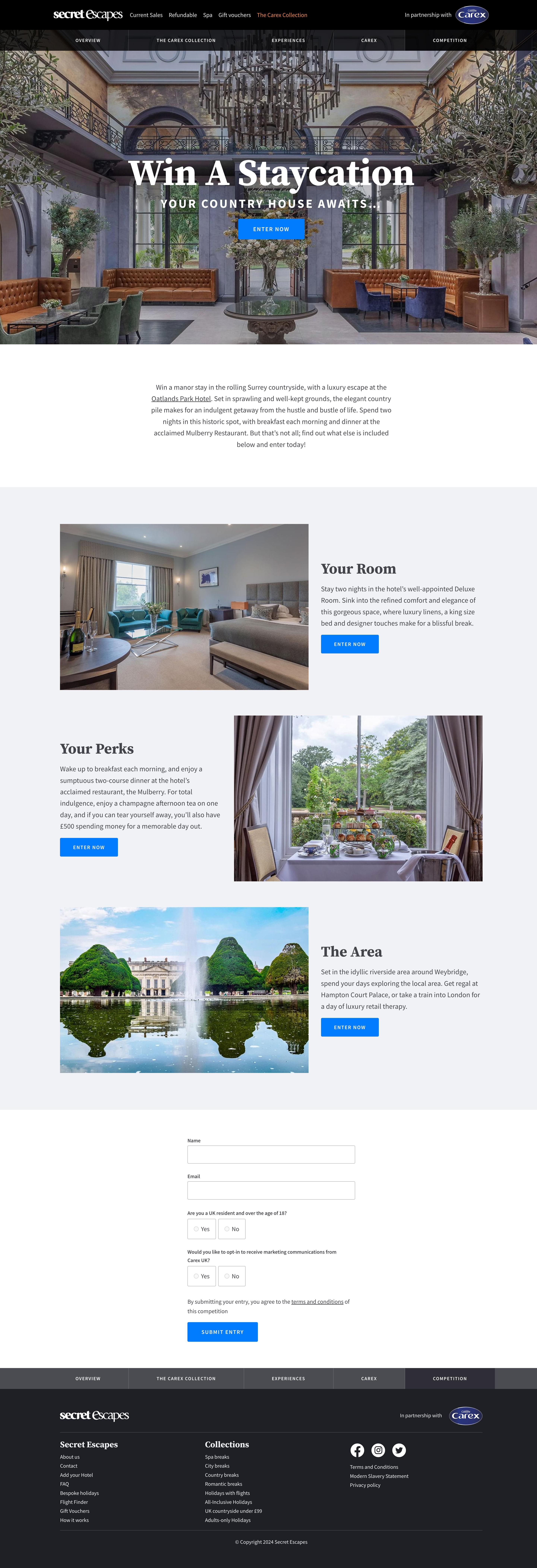 We launched a sampling campaign across some of our finest UK hotels. 40,000 samples were sent to six properties, placed in rooms with a postcard encouraging guests to submit a photo to win a staycation. A microsite with content promoting daring and lesser-known experiences across the UK also served to explain the partnership and encourage members to book a break in the Carex-sponsored collection.