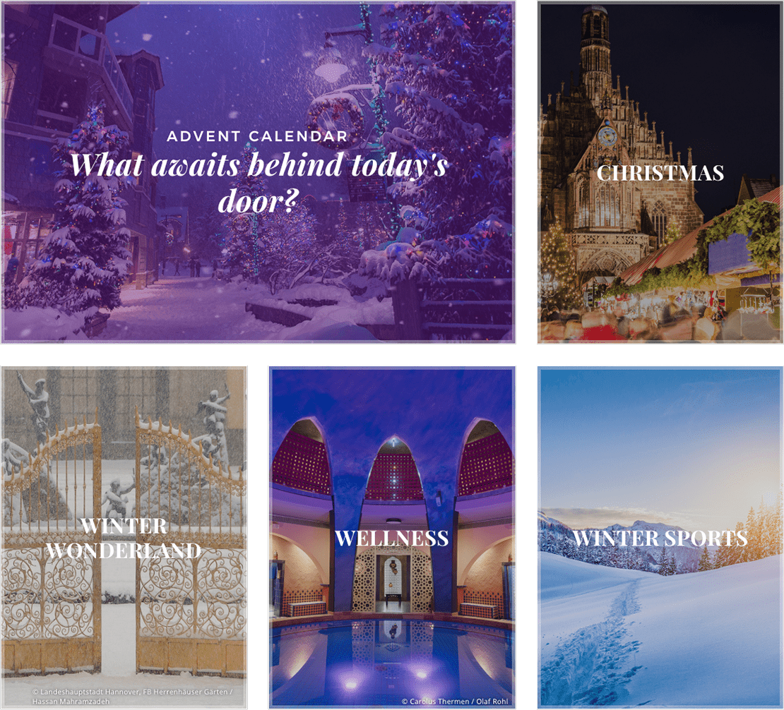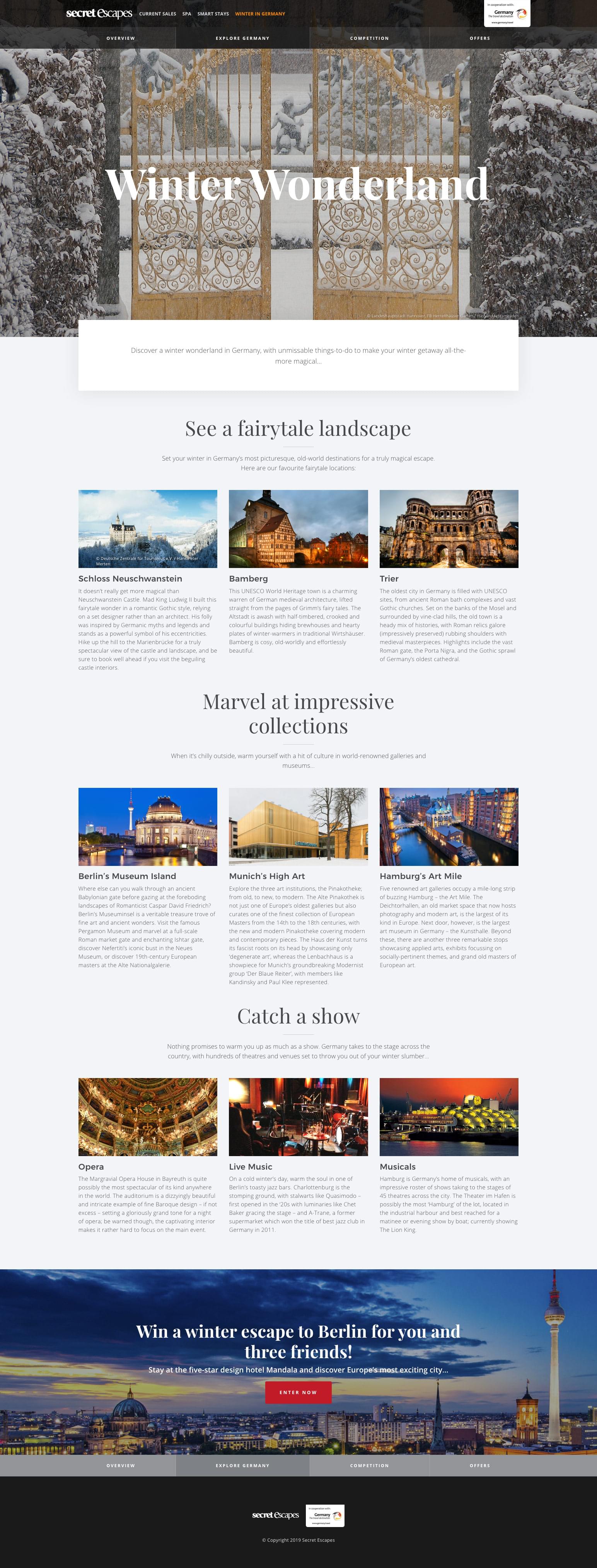 A central microsite hosted diverse pieces of content, including a countdown advent calendar integrated into a display campaign. Covering themes like wellness, festive markets and winter to-dos, our hub became the go-to for winter inspiration. Underpinning this content was a ‘Winter in Germany’ film, which saw our editor show the best of seasonal Germany from Berlin to the Bavarian Alps. Our content was complemented by a range of handpicked offers for our members to book.